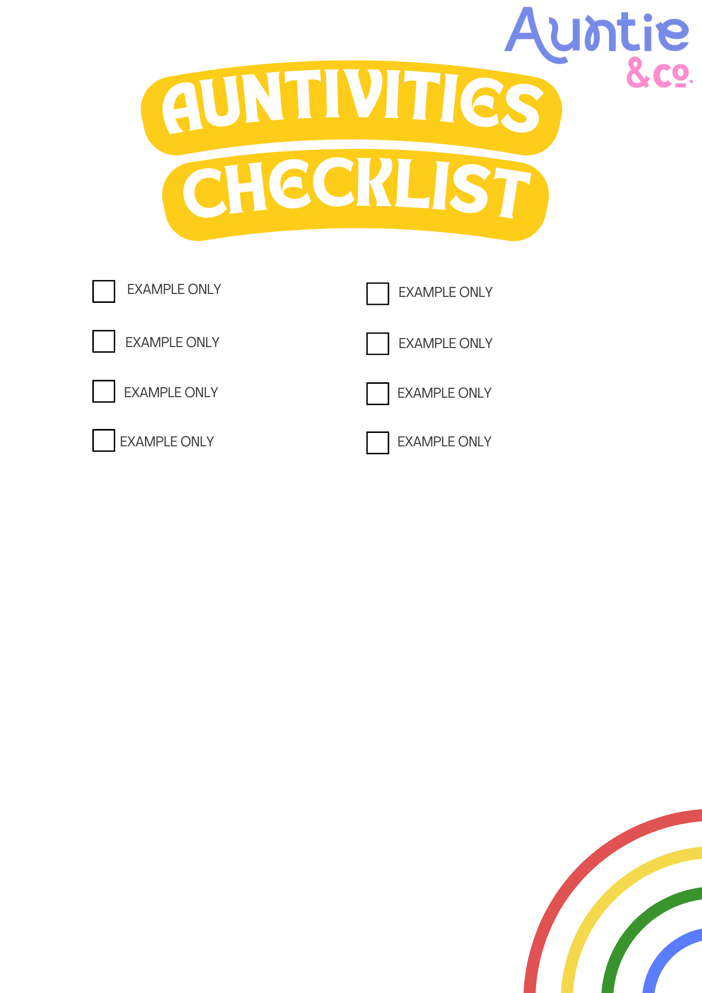 Over 300 alphabetized and categorized activities for aunties and nieces/nephews to enjoy together! This super bright and colorful digital guide features activities to suit all age groups and budgets and includes a checklist to tick off all the fun activities once completed.